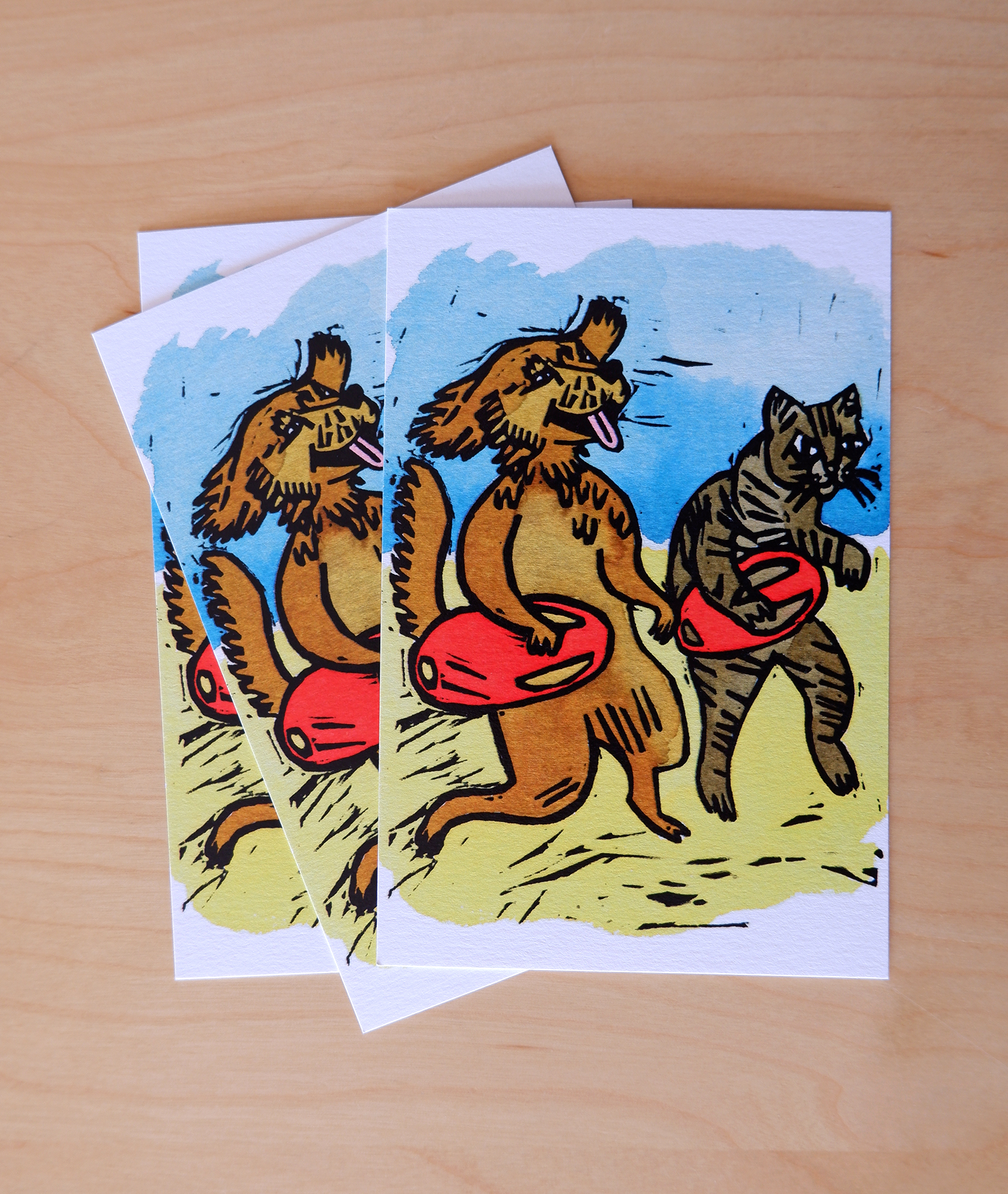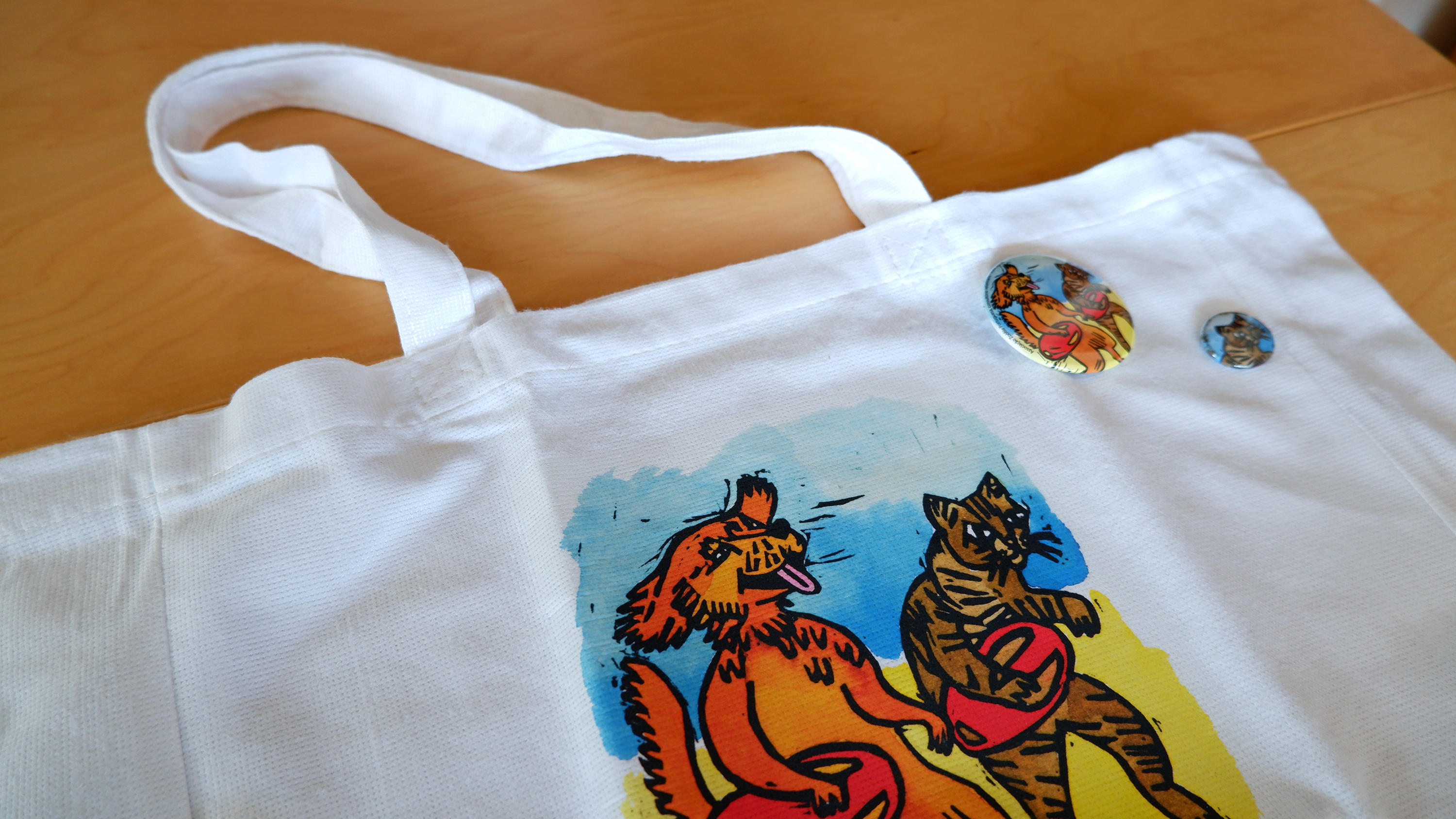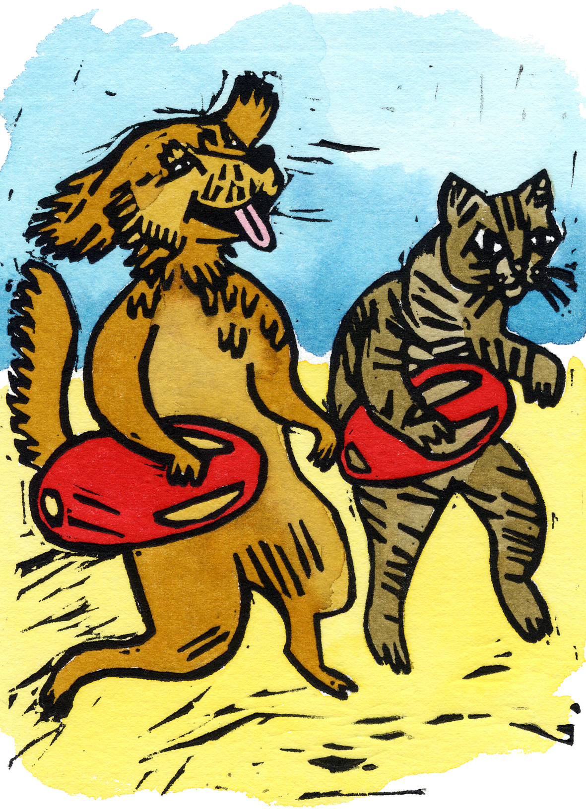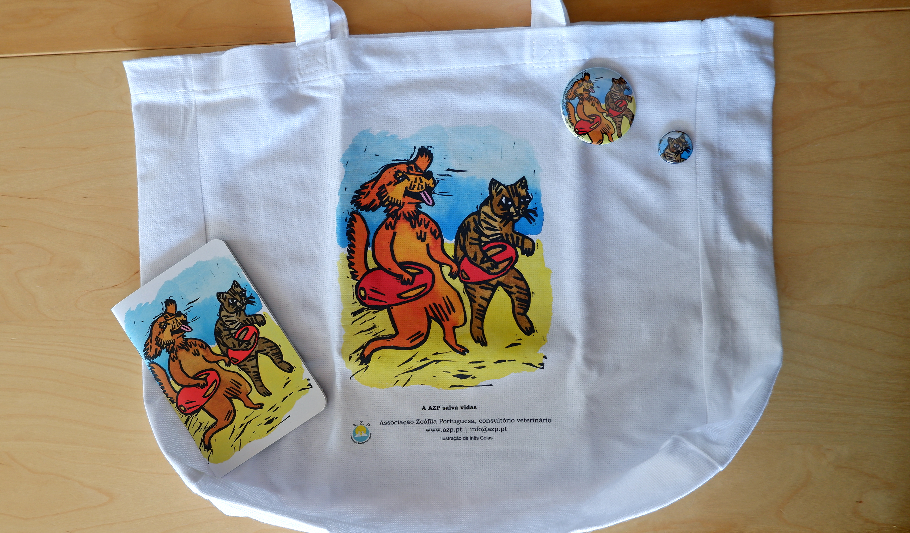 Gravura em linóleo com pintura em ecoline. Ilustração para aplicação em materiais de divulgação e angariação de fundos: cadernos, postais, crachás e sacos.