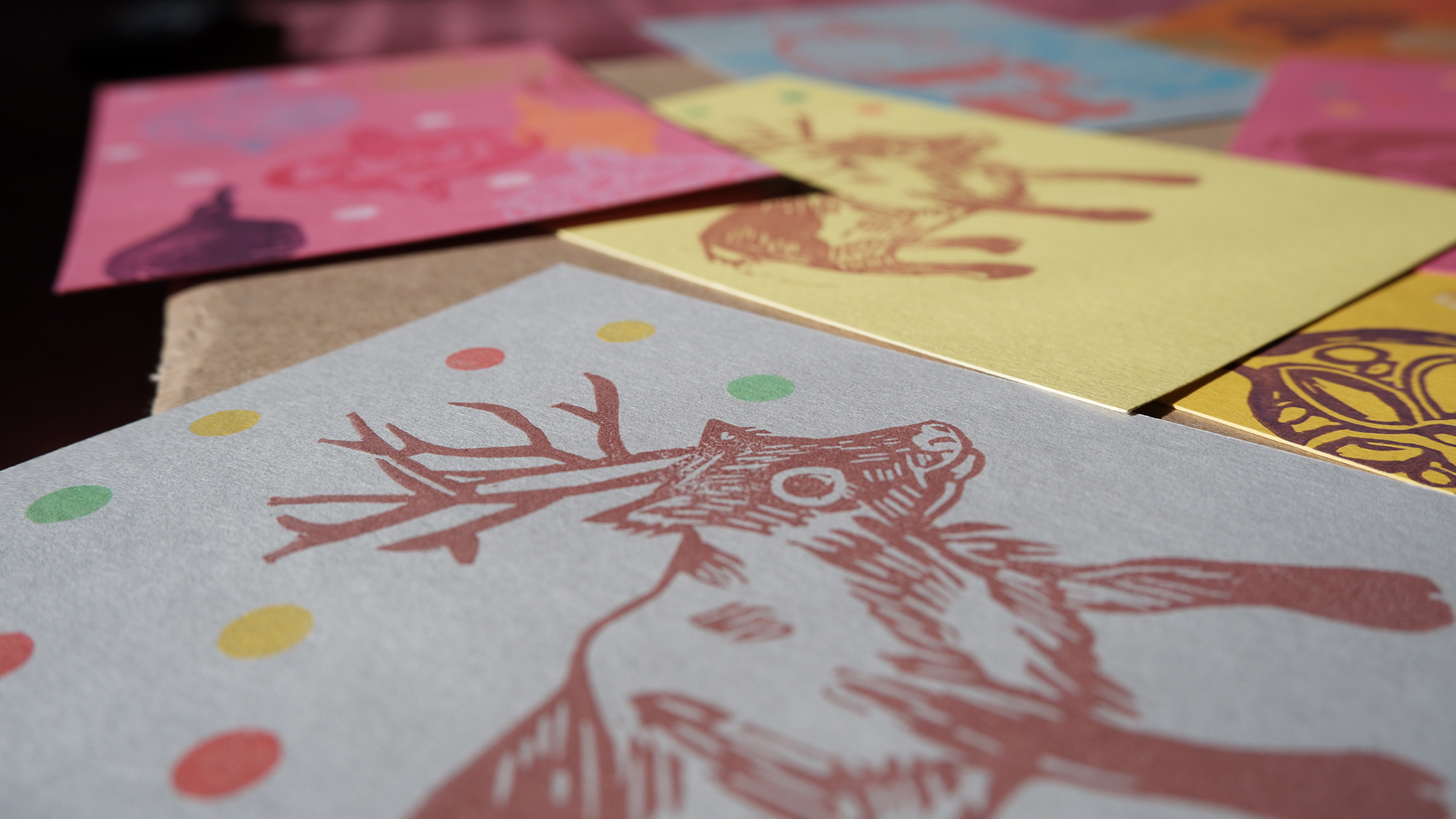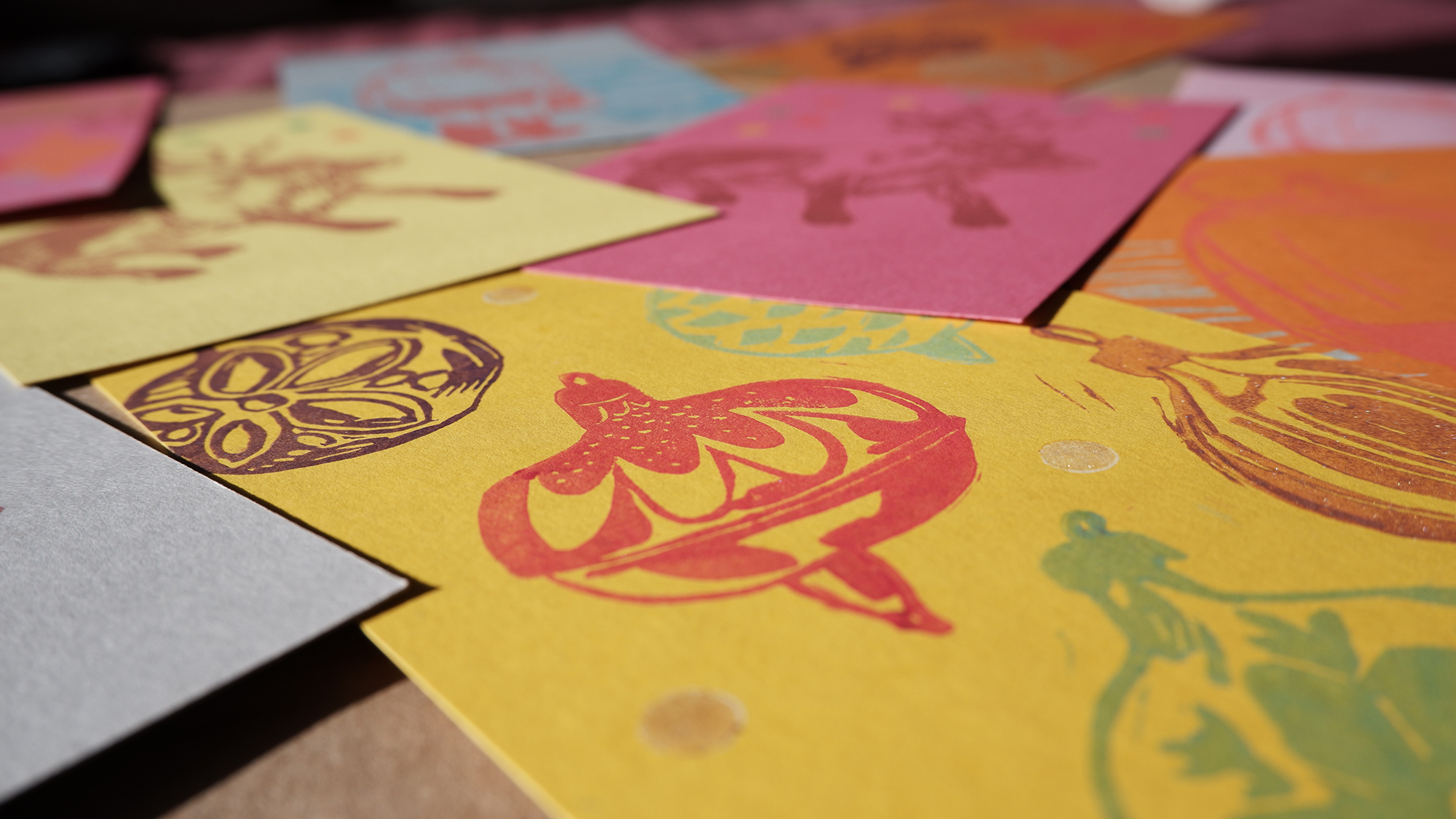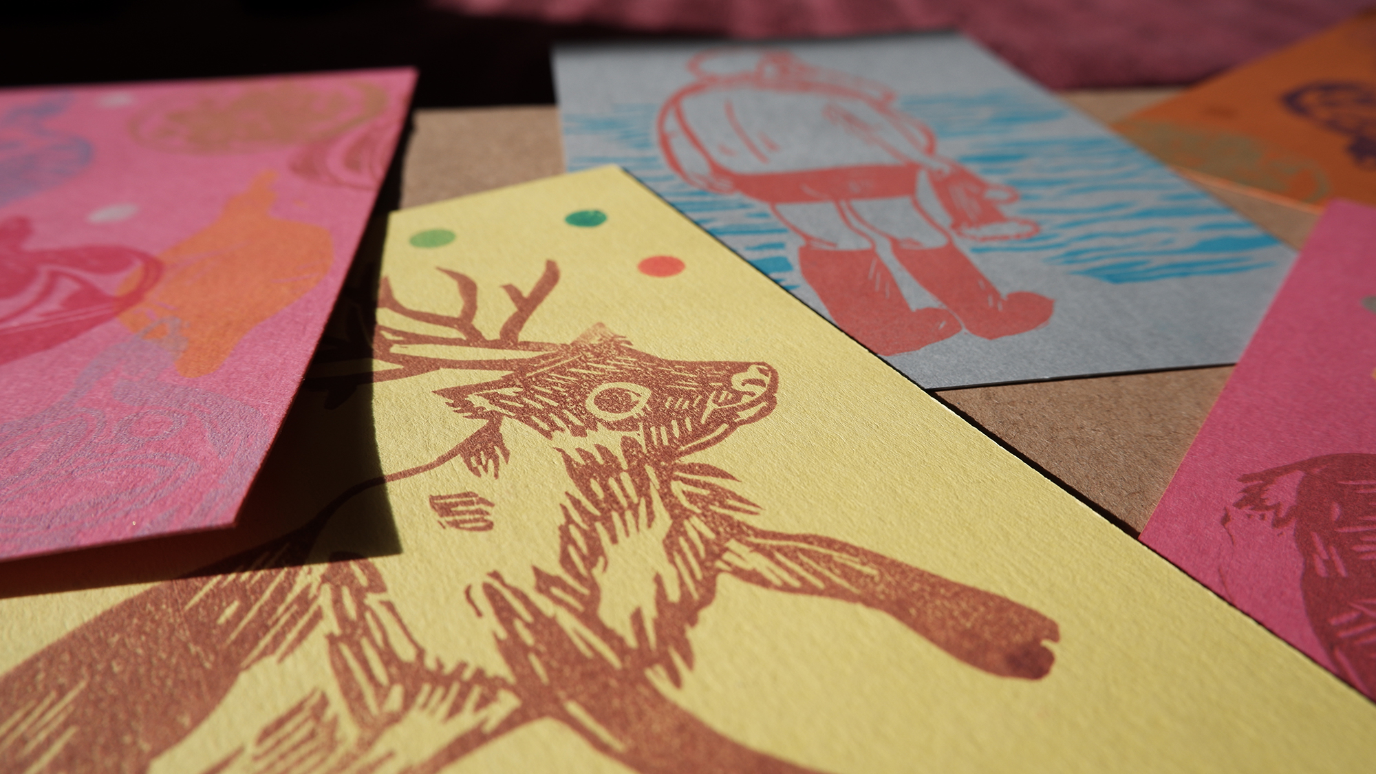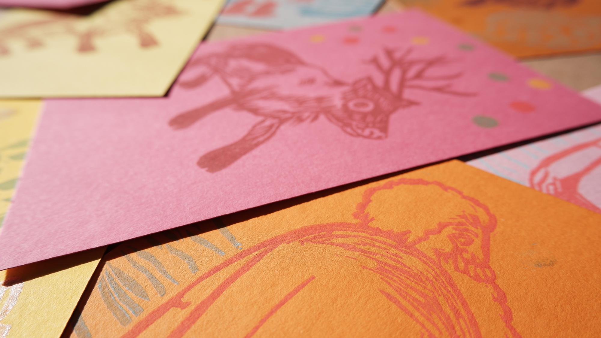 Postais 10x15 impressos com recurso a carimbos.