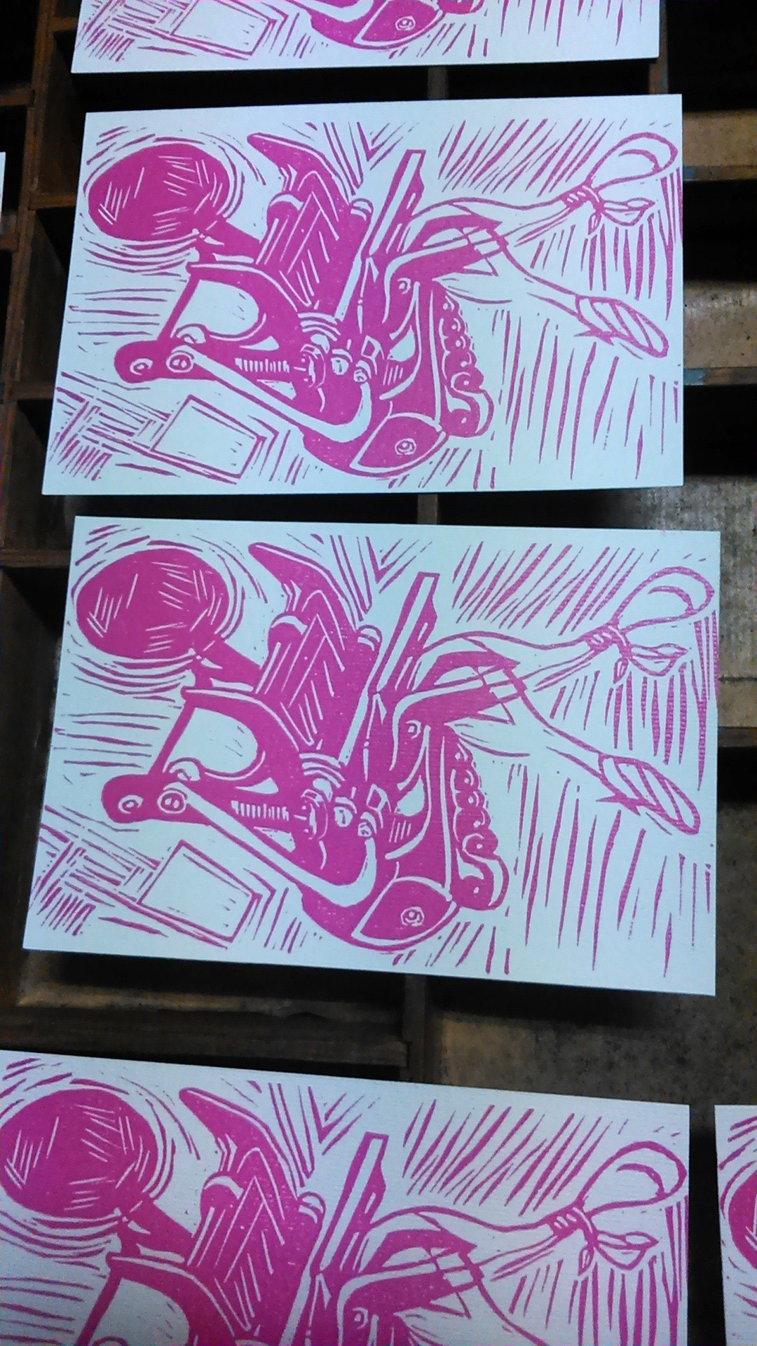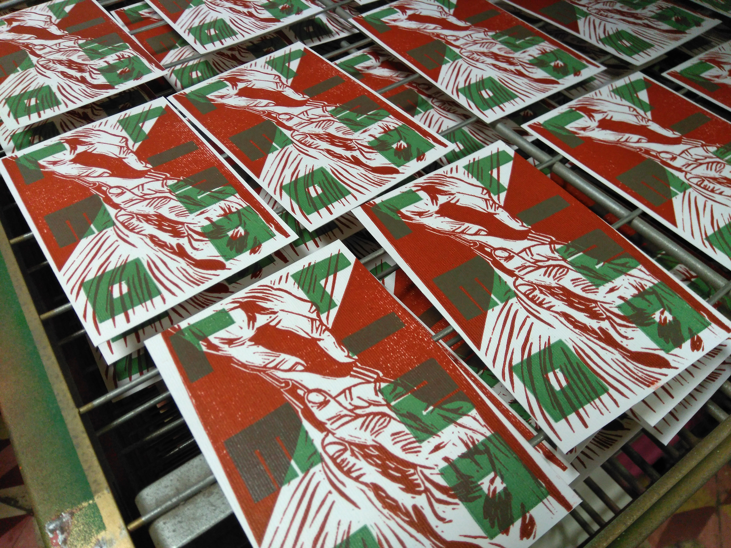 Postais 10x15 impressos em tipografia de caracteres móveis e gravura em linóleo, 100 exemplares numerados e carimbados.